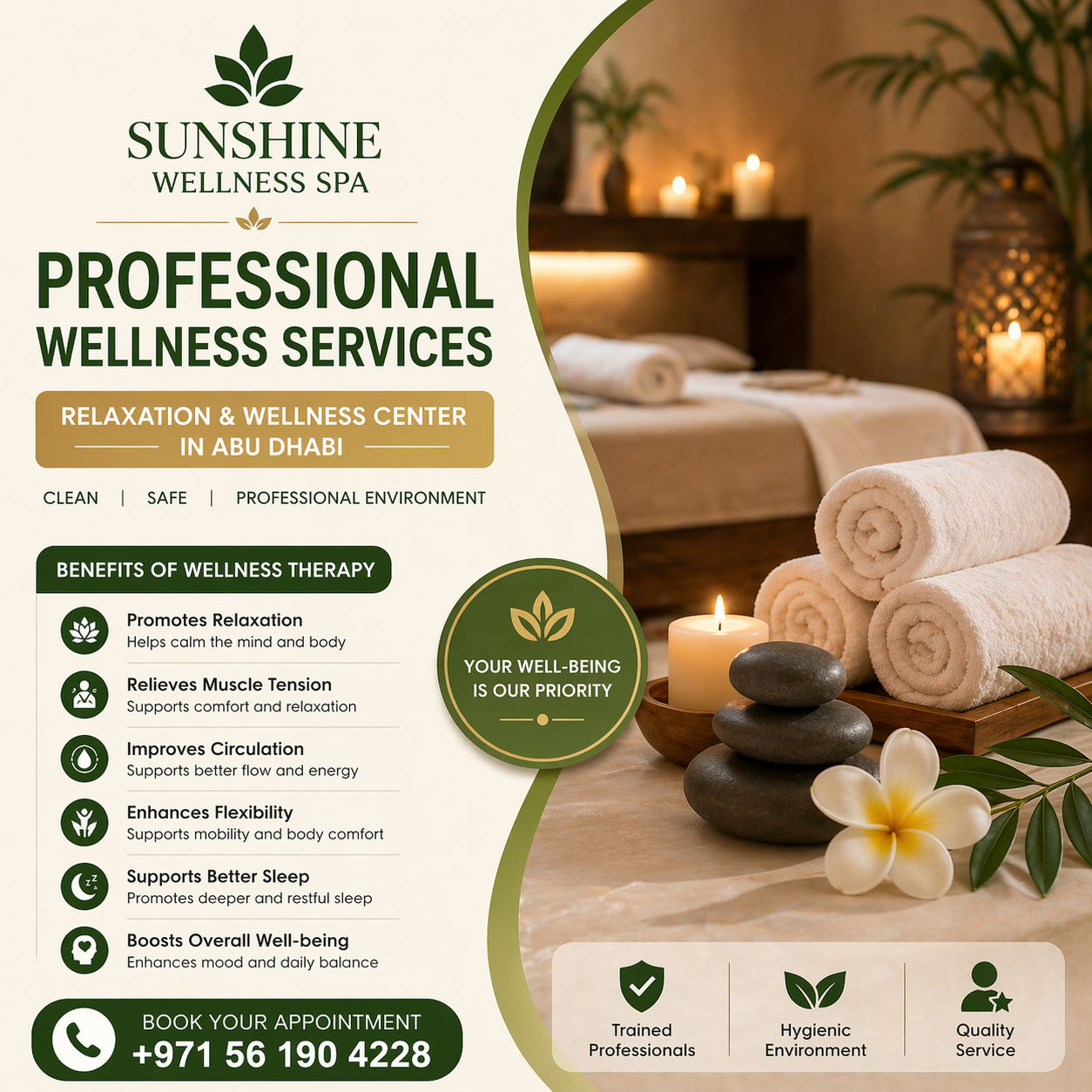 Located in Baniyas East, our spa is an oasis for you to unwind and rejuvenate. Our dedicated team is committed to delivering the highest quality service, ensuring your time at Sunshine Wellness Spa is truly unforgettable.